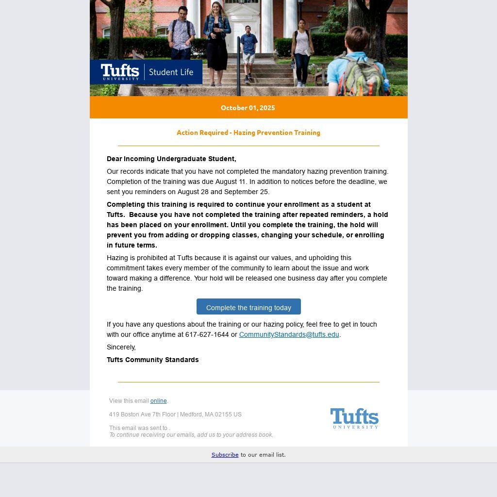 Completing this training is required to continue your enrollment as a student at Tufts. Because you have not completed the training after repeated reminders, a hold has been placed on your enrollment. Until you complete the training, the hold will prevent you from adding or dropping classes, changing your schedule, or enrolling in future terms.