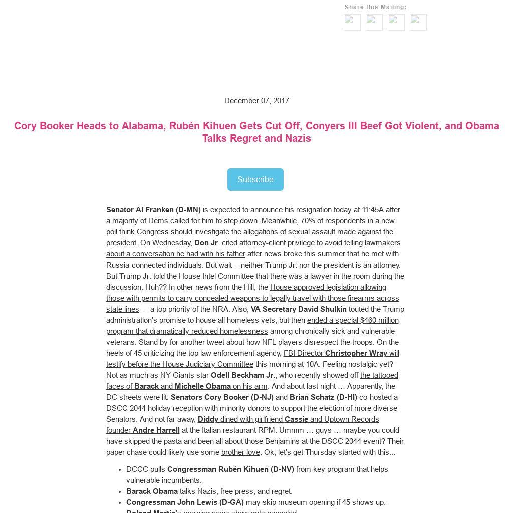 Senator Al Franken (D-MN) is expected to announce his resignation today at 11:45A after a majority of Dems called for him to step down. Meanwhile, 70% of respondents in a new poll think Congress should investigate the allegations of sexual assault made against the president. On Wednesday, Don Jr. cited attorney-client privilege to avoid telling lawmakers about a conversation he had with his father after news broke this summer that he met with Russia-connected individuals. But wait -- neither Trump Jr. nor the president is an attorney. But Trump Jr. told the House Intel Committee that there was a lawyer in the room during the discussion. Huh?? In other news from the Hill, the House approved legislation allowing those with permits to carry concealed weapons to legally travel with those firearms across state lines -- a top priority of the NRA. Also, VA Secretary David Shulkin touted the Trump administration’s promise to house all homeless vets, but then ended a special $460 million program that dramatically reduced homelessness among chronically sick and vulnerable veterans. Stand by for another tweet about how NFL players disrespect the troops. On the heels of 45 criticizing the top law enforcement agency, FBI Director Christopher Wray will testify before the House Judiciary Committee this morning at 10A. Feeling nostalgic yet? Not as much as NY Giants star Odell Beckham Jr., who recently showed off the tattooed faces of Barack and Michelle Obama on his arm. And about last night … Apparently, the DC streets were lit. Senators Cory Booker (D-NJ) and Brian Schatz (D-HI) co-hosted a DSCC 2044 holiday reception with minority donors to support the election of more diverse Senators. And not far away, Diddy dined with girlfriend Cassie and Uptown Records founder Andre Harrell at the Italian restaurant RPM. Ummm … guys … maybe you could have skipped the pasta and been all about those Benjamins at the DSCC 2044 event? Their paper chase could likely use some brother love. Ok, let’s get Thursday started with this...