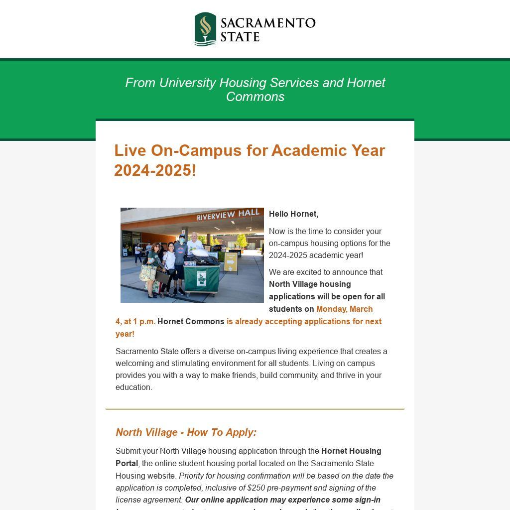 Don’t delay! Live Like A Hornet and reserve your space for 2024-2025 on-campus housing at Sacramento State!