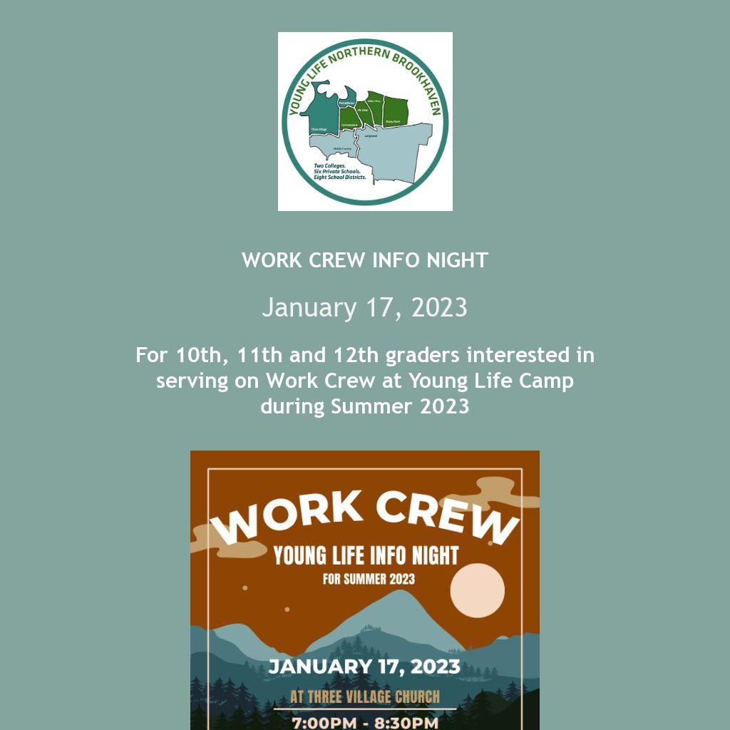 Four weeks from tonight is the first step for those interested in serving on Work Crew for summer 2023.
