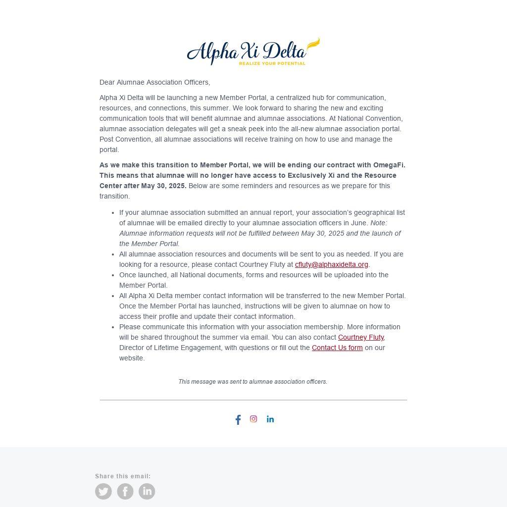 As we make this transition to Member Portal, we will be ending our contract with OmegaFi. This means that alumnae will no longer have access to Exclusively Xi and the Resource Center after May 30, 2025. Below are some reminders and resources as we prepare for this transition.
