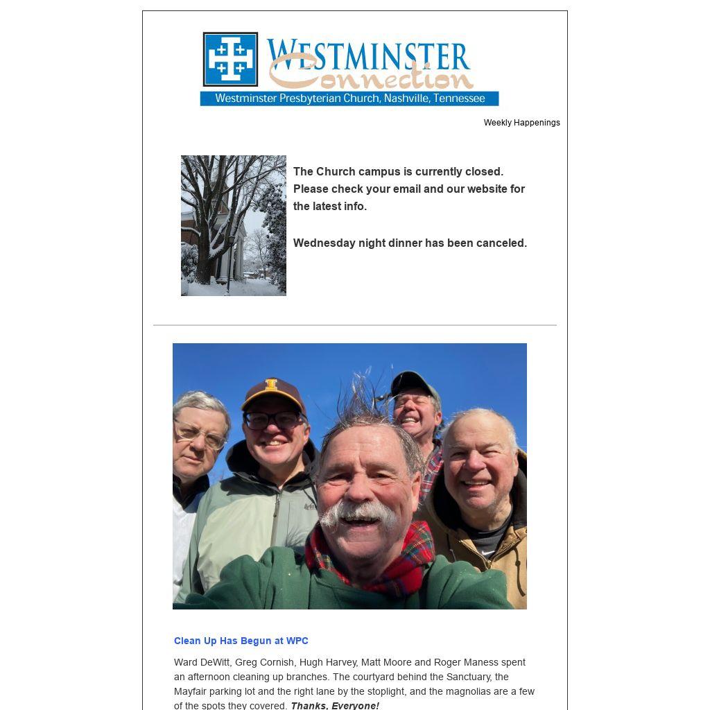 Ward DeWitt, Greg Cornish, Hugh Harvey, Matt Moore and Roger Maness spent an afternoon cleaning up branches. The courtyard behind the Sanctuary, the Mayfair parking lot and the right lane by the stoplight, and the magnolias are a few of the spots they covered. Thanks, Everyone!