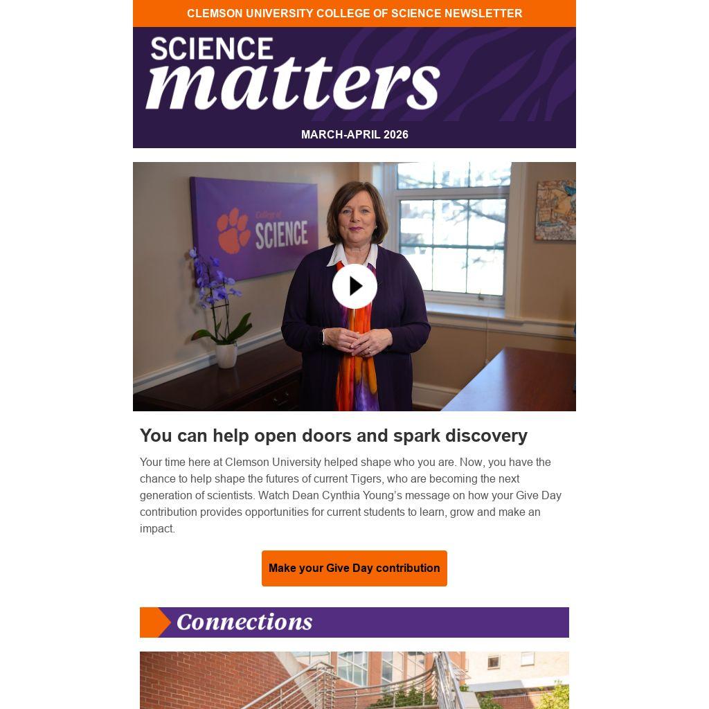 Your time here at Clemson University helped shape who you are. Now, you have the chance to help shape the futures of current Tigers, who are becoming the next generation of scientists. Watch Dean Cynthia Young’s message on how your Give Day contribution provides opportunities for current students to learn, grow and make an impact.