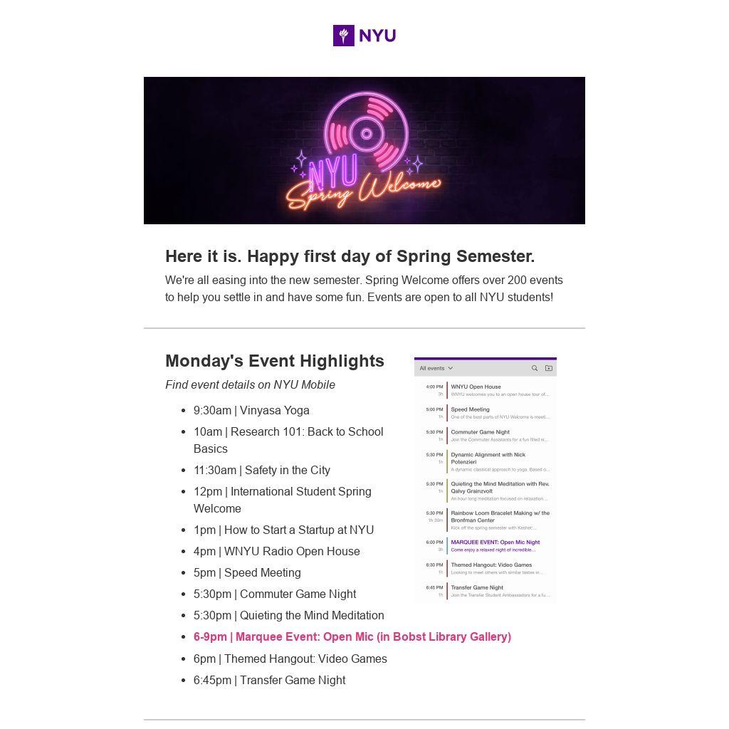 We're all easing into the new semester. Spring Welcome offers over 200 events to help you settle in and have some fun. Events are open to all NYU students!