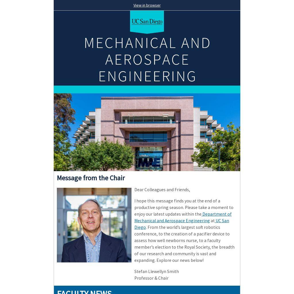 I hope this message finds you at the end of a productive spring season. Please take a moment to enjoy our latest updates within the Department of Mechanical and Aerospace Engineering at UC San Diego. From the world’s largest soft robotics conference, to the creation of a pacifier device to assess how well newborns nurse, to a faculty member’s election to the Royal Society, the breadth of our research and community is vast and expanding. Explore our news below!