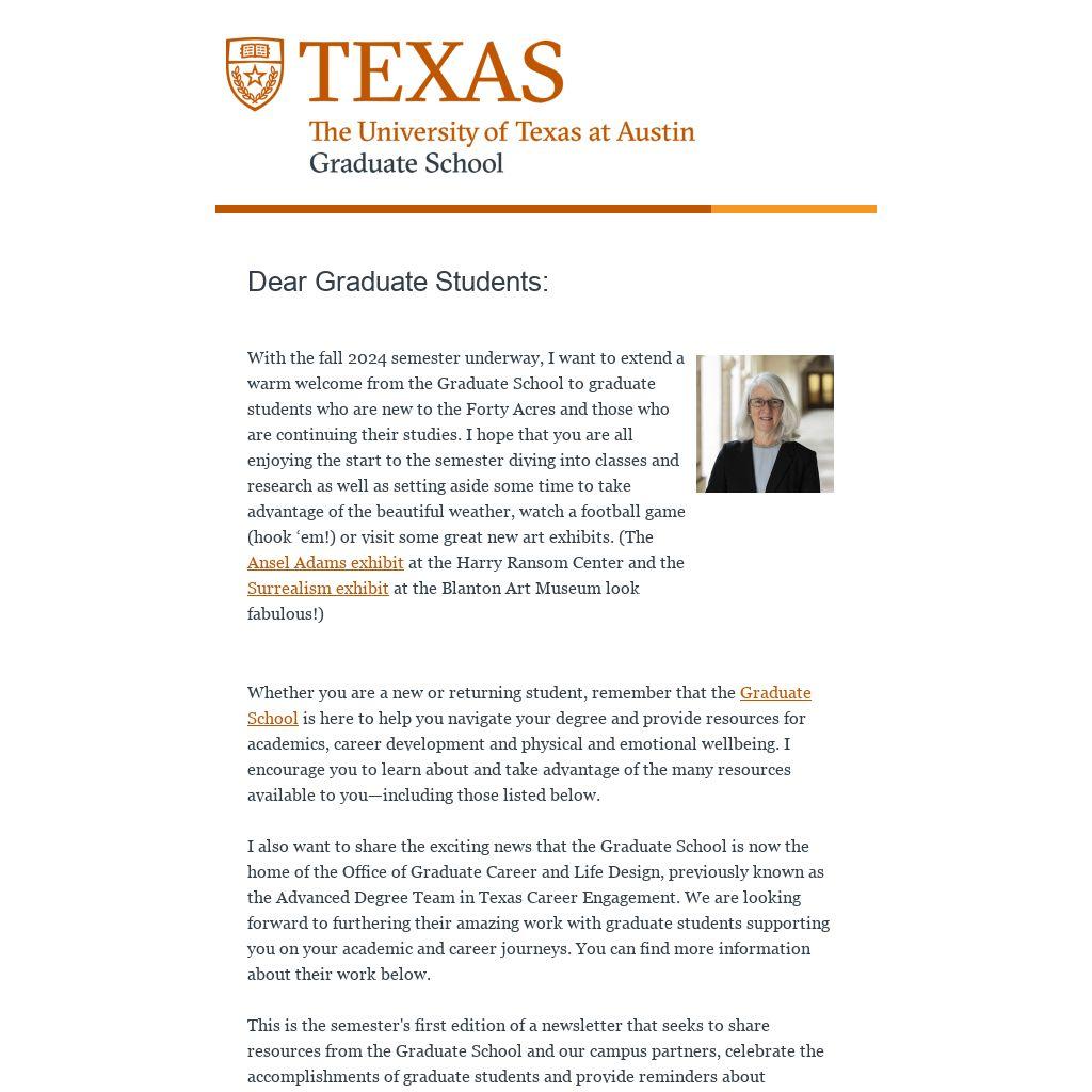 With the fall 2024 semester underway, I want to extend a warm welcome from the Graduate School to graduate students who are new to the Forty Acres and those who are continuing their studies. I hope that you are all enjoying the start to the semester diving into classes and research as well as setting aside some time to take advantage of the beautiful weather, watch a football game (hook ‘em!) or visit some great new art exhibits. (The Ansel Adams exhibit at the Harry Ransom Center and the Surrealism exhibit at the Blanton Art Museum look fabulous!)