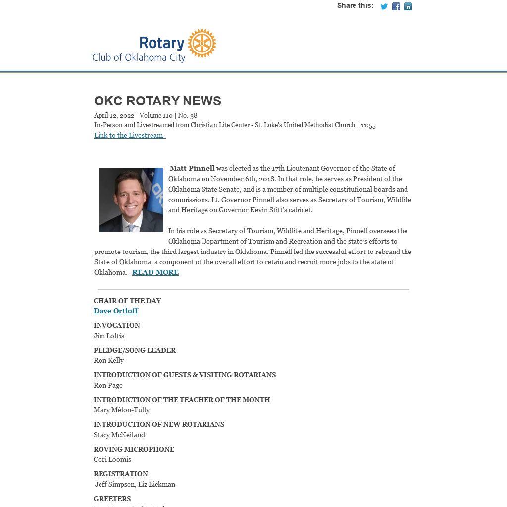 Rotary shines through: We’re all very aware at this point of the devastation that is taking place in the world. It’s with sadness that we watch and see loved ones separated from each other and individuals making decisions that they themselves will likely never have to live with or feel the pain. And then insert Rotary, an organization without borders. When those that are elected to lead, just talk, Rotary moves in to serve, when governments can’t decide on which crisis to prioritize, Rotary moves in and problem solves, and when entire countries are at war, Rotary moves in and finds the common ground of serving the needs of food, water, medicine, clothing and shelter. It’s with great pride that I’m part of an organization of doers, which is why I’m very excited to announce our district’s decision to join up with other districts around the world and contribute to the Disaster Relief Fund, where all donations received before the end of April will go towards helping the near 5 million people that have been displaced due to this tragedy. There are those that talk and those that do, thank you for being a doer, thank you for being a Rotarian. Last, our District Conference registration is now open! After two years apart, we hope to see you all for an evening of celebration at the First Americans Museum in Oklahoma City. In addition to an outstanding dinner and program, the museum will be hosting private tours of their galleries for all attendees. Register now! Matt Tipton District Governor 2021-2022