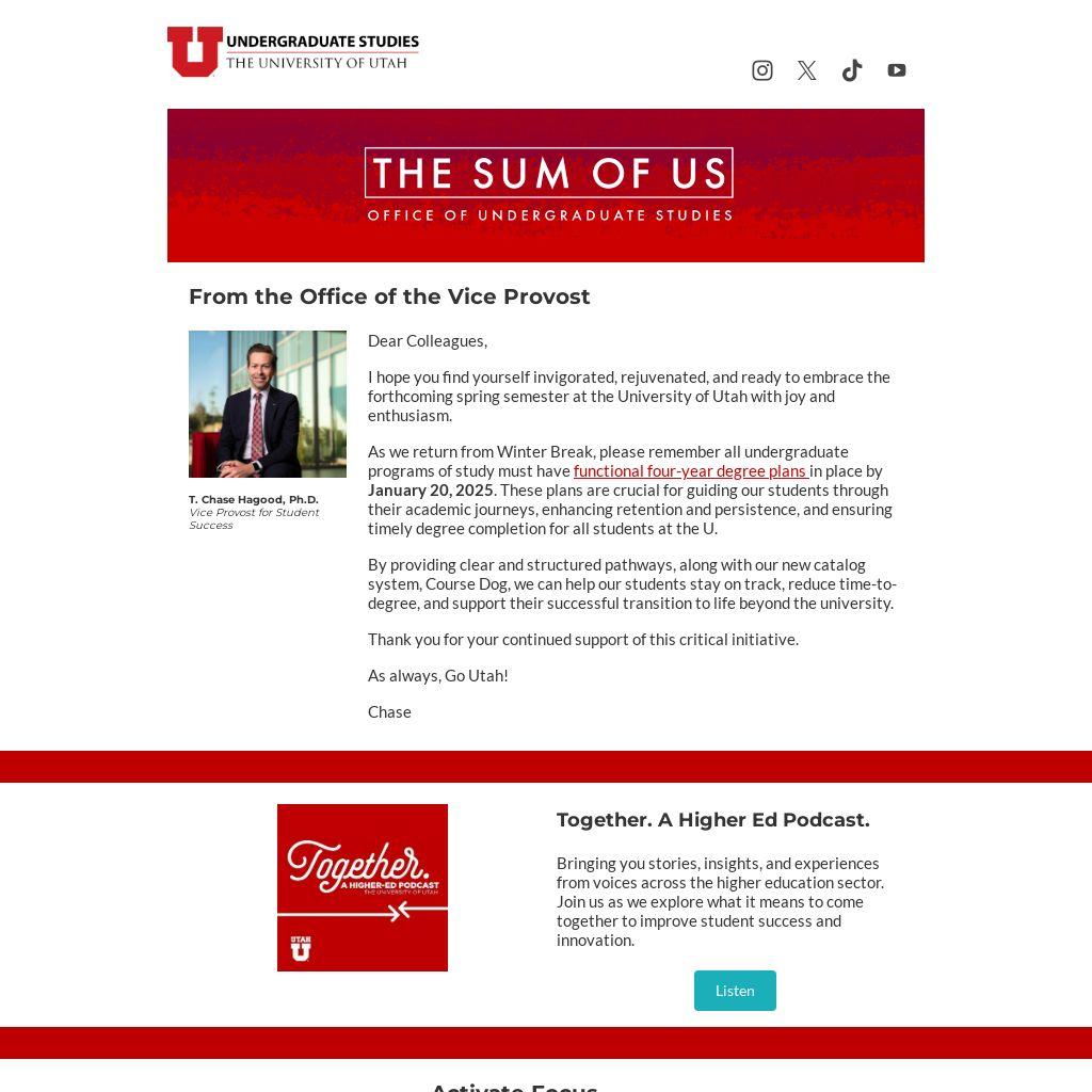 I hope you find yourself invigorated, rejuvenated, and ready to embrace the forthcoming spring semester at the University of Utah with joy and enthusiasm.