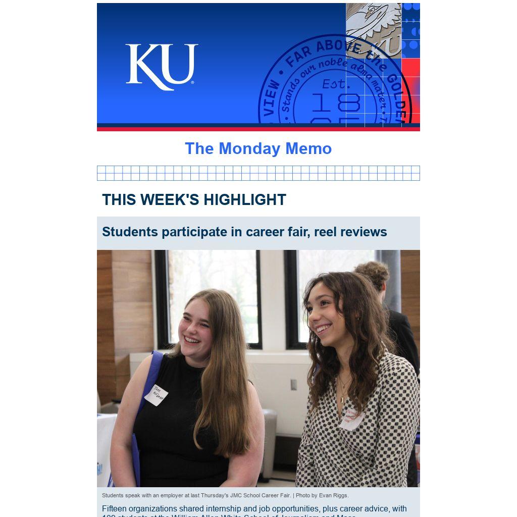 Fifteen organizations shared internship and job opportunities, plus career advice, with 109 students at the William Allen White School of Journalism and Mass Communications Career Fair on Thursday at Stauffer-Flint Hall. The LinkedIn photo booth attracted 65 students, two faculty members and a staff member. In addition to journalism and mass communication, other majors represented were English, accounting, film and media, business administration, finance and atmospheric sciences. On Wednesday, recruiters from KMBC, Gray TV, KAKE and FOX4 reviewed 29 student reels during 52 sessions.
