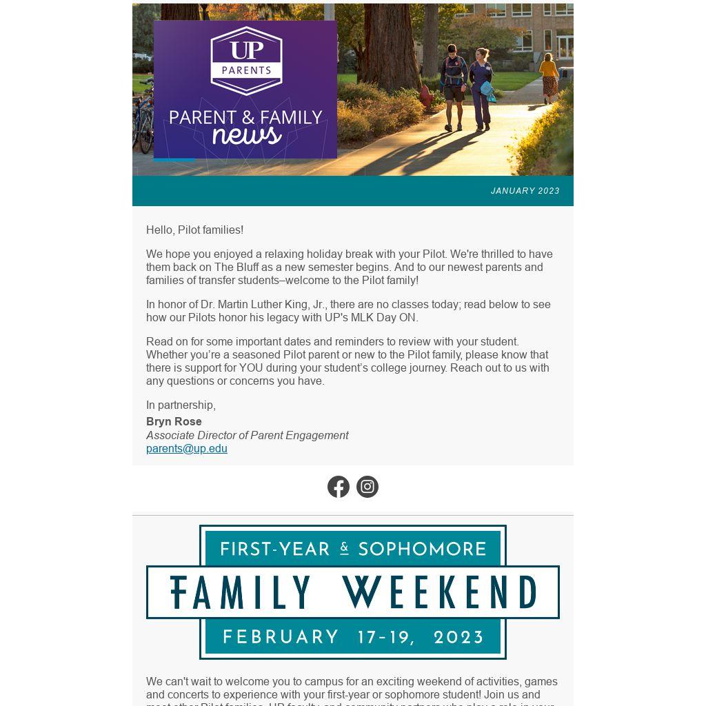 We can't wait to welcome you to campus for an exciting weekend of activities, games and concerts to experience with your first-year or sophomore student! Join us and meet other Pilot families, UP faculty, and community partners who play a role in your student’s home away from home.