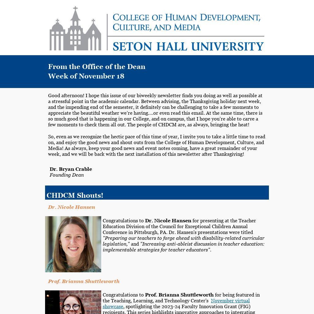 So, even as we recognize the hectic pace of this time of year, I invite you to take a little time to read on, and enjoy the good news and shout outs from the College of Human Development, Culture, and Media! As always, keep your good news and event notes coming, have a great remainder of your week, and we will be back with the next installation of this newsletter after Thanksgiving!