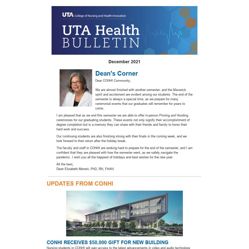 The faculty and staff in CONHI are working hard to prepare for the end of the semester, and I am confident that they are pleased with how the semester went, as we safely navigate the pandemic. I wish you all the happiest of holidays and best wishes for the new year.