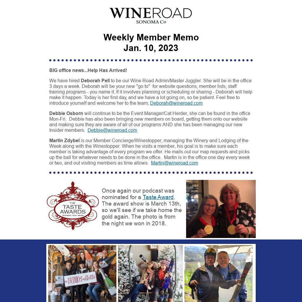 We have hired Deborah Pell to be our Wine Road Admin/Master Juggler. She will be in the office 3 days a week. Deborah will be your new "go to" for website questions, member lists, staff training programs - you name it. If it involves planning or scheduling or sharing - Deborah will help make it happen. Today is her first day, and we have a lot going on, so be patient. Feel free to introduce yourself and welcome her to the team; Deborah@wineroad.com