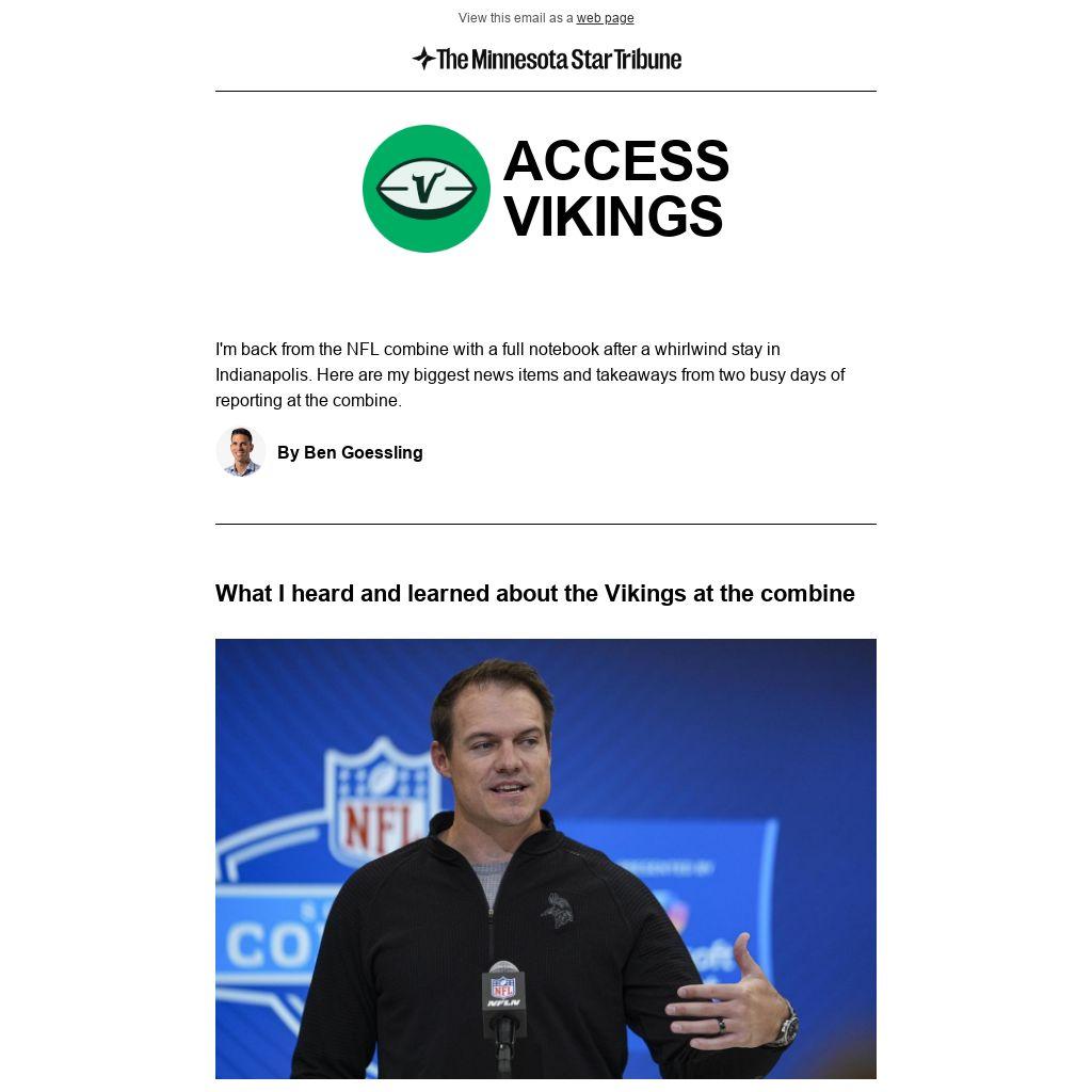 Many of my conversations with team and league personnel in Indianapolis centered on Darnold, and the progress of J.J. McCarthy, as the Vikings sort out an unexpected bottleneck caused by a welcomed problem (Darnold’s 35-TD Pro Bowl season) at quarterback. But there were plenty of other topics, from the Vikings’ plans for their defense to the coaching staff and front office, during the 52 hours I spent in Indianapolis for the combine this week.
