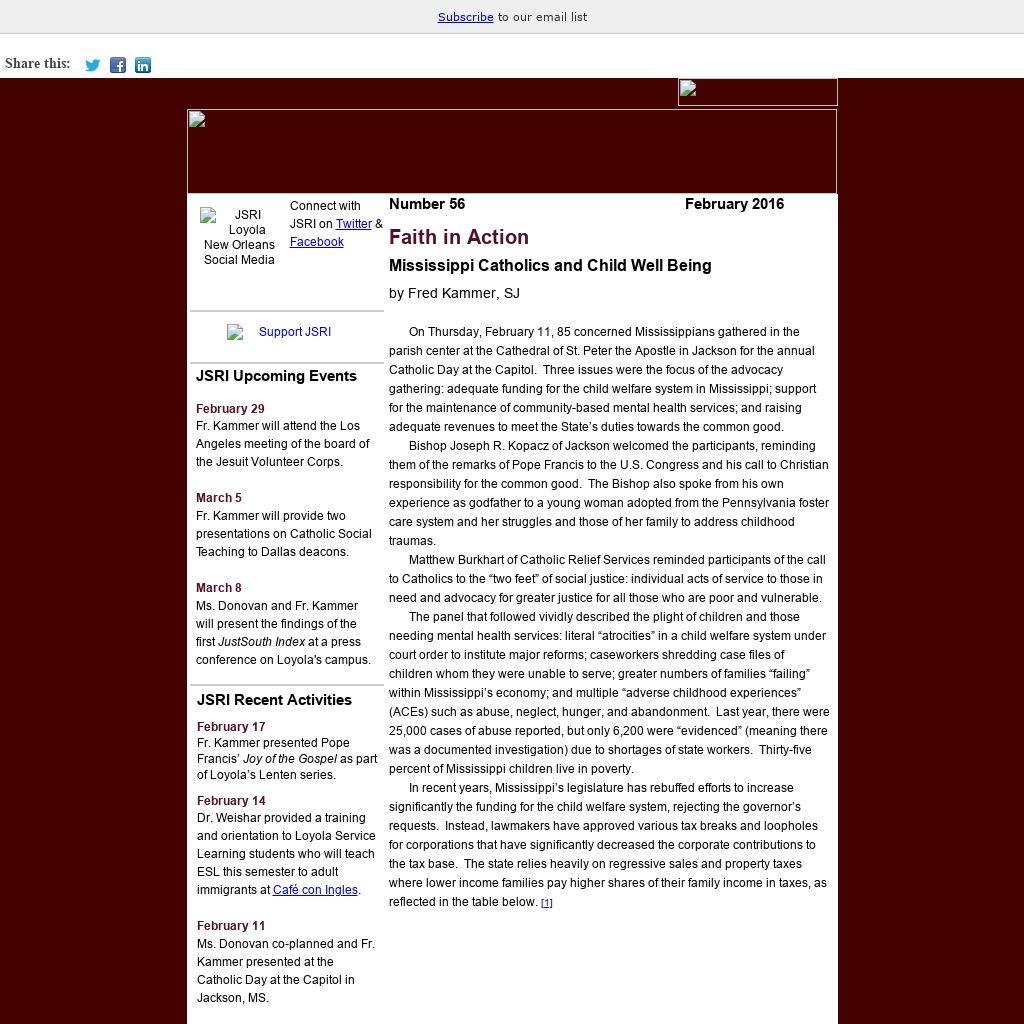 On Thursday, February 11, 85 concerned Mississippians gathered in the parish center at the Cathedral of St. Peter the Apostle in Jackson for the annual Catholic Day at the Capitol. Three issues were the focus of the advocacy gathering: adequate funding for the child welfare system in Mississippi; support for the maintenance of community-based mental health services; and raising adequate revenues to meet the State’s duties towards the common good.
