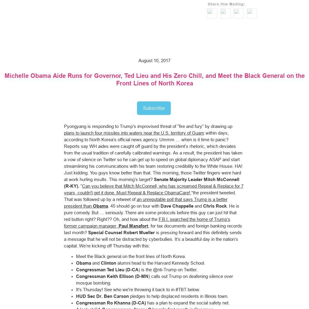 Pyongyang is responding to Trump’s improvised threat of “fire and fury” by drawing up plans to launch four missiles into waters near the U.S. territory of Guam within days, according to North Korea’s official news agency. Ummm … when is it time to panic? Reports say WH aides were caught off guard by the president’s rhetoric, which deviates from the usual tradition of carefully calibrated warnings. As a result, the president has taken a vow of silence on Twitter so he can get up to speed on global diplomacy ASAP and start streamlining his communications with his team restoring credibility to the White House. HA! Just kidding. You guys know better than that. This morning, those Twitter fingers were hard at work hurling insults. This morning’s target? Senate Majority Leader Mitch McConnell (R-KY). “Can you believe that Mitch McConnell, who has screamed Repeal & Replace for 7 years, couldn't get it done. Must Repeal & Replace ObamaCare!,”the president tweeted. That was followed up by a retweet of an unreputable poll that says Trump is a better president than Obama. 45 should go on tour with Dave Chappelle and Chris Rock. He is pure comedy. But … seriously. There are some protocols before this guy can just hit that red button right? Right?? Oh, and how about the F.B.I. searched the home of Trump’s former campaign manager, Paul Manafort, for tax documents and foreign banking records last month? Special Counsel Robert Mueller is pressing forward and this definitely sends a message that he will not be distracted by cyberbullies. It’s a beautiful day in the nation’s capital. We’re kicking off Thursday with this: