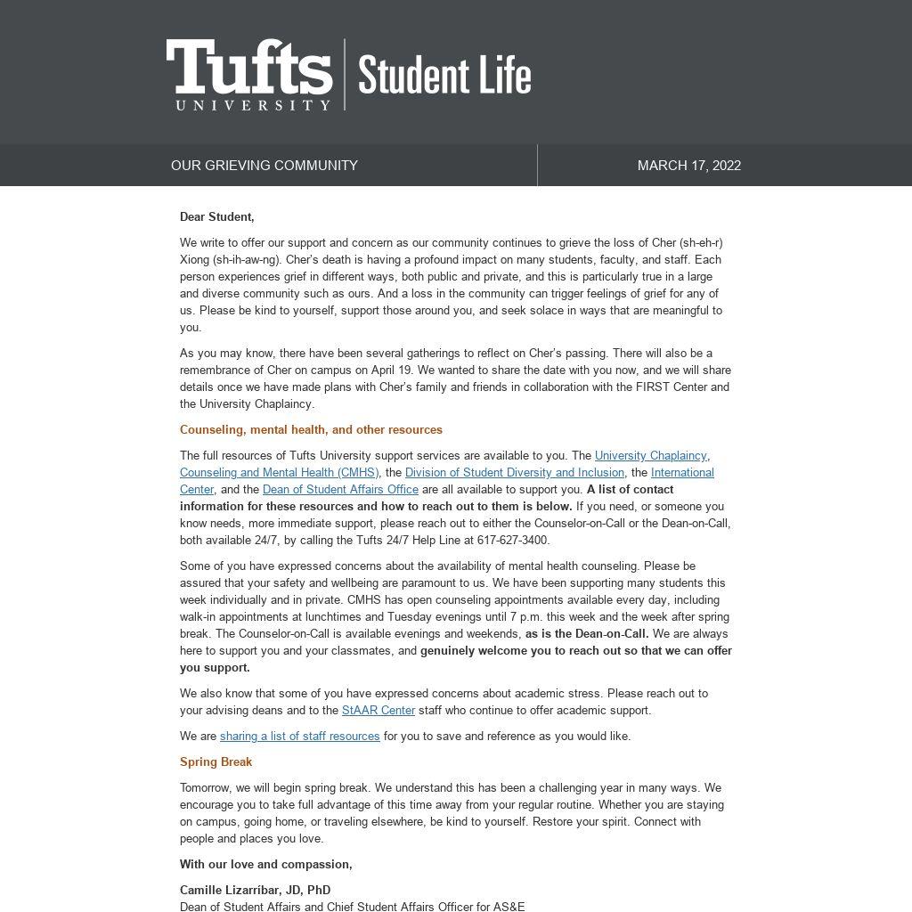 We write to offer our support and concern as our community continues to grieve the loss of Cher (sh-eh-r) Xiong (sh-ih-aw-ng). Cher’s death is having a profound impact on many students, faculty, and staff. Each person experiences grief in different ways, both public and private, and this is particularly true in a large and diverse community such as ours. And a loss in the community can trigger feelings of grief for any of us. Please be kind to yourself, support those around you, and seek solace in ways that are meaningful to you.