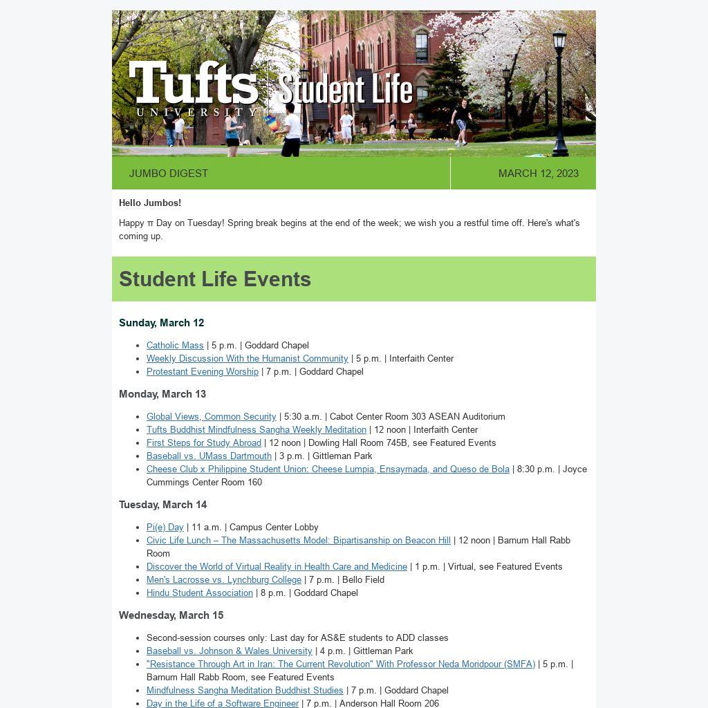 Students and Student Organizations can submit events to JumboLife! Add your event by Thursday at 12 noon each week, and we'll include it in the Jumbo Digest on Sunday.