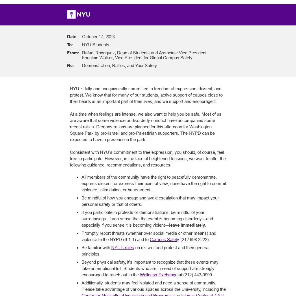 Consistent with NYU’s commitment to free expression, you should, of course, feel free to participate. However, in the face of heightened tensions, we want to offer the following guidance, recommendations, and resources: