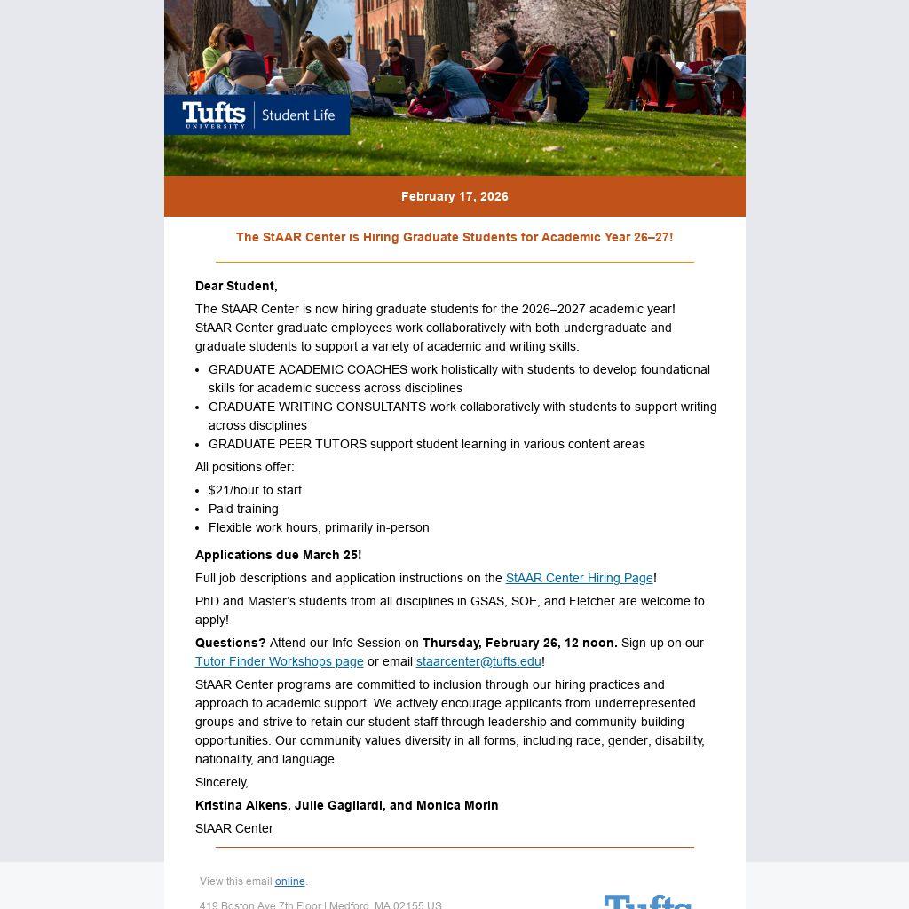 Questions? Attend our Info Session on Thursday, February 26, 12 noon. Sign up on our Tutor Finder Workshops page or email staarcenter@tufts.edu!