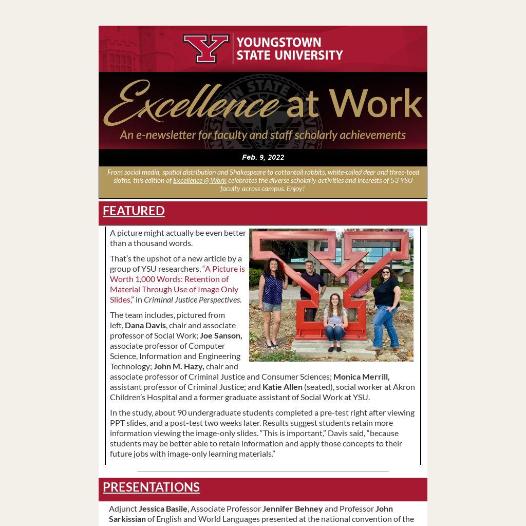 Excellence at Work, published by the YSU Office of Marketing and Communications, recognizes and celebrates the scholarly work and honors of the faculty and staff of Youngstown State University. To submit items for inclusion, complete the online form.For more information, contact Ron Cole, director of University Communications, at racole01@ysu.edu or 330-941-3285, or Becky Rose, assistant director of University Communications, at rarose01@ysu.edu or 330-941-2159.
