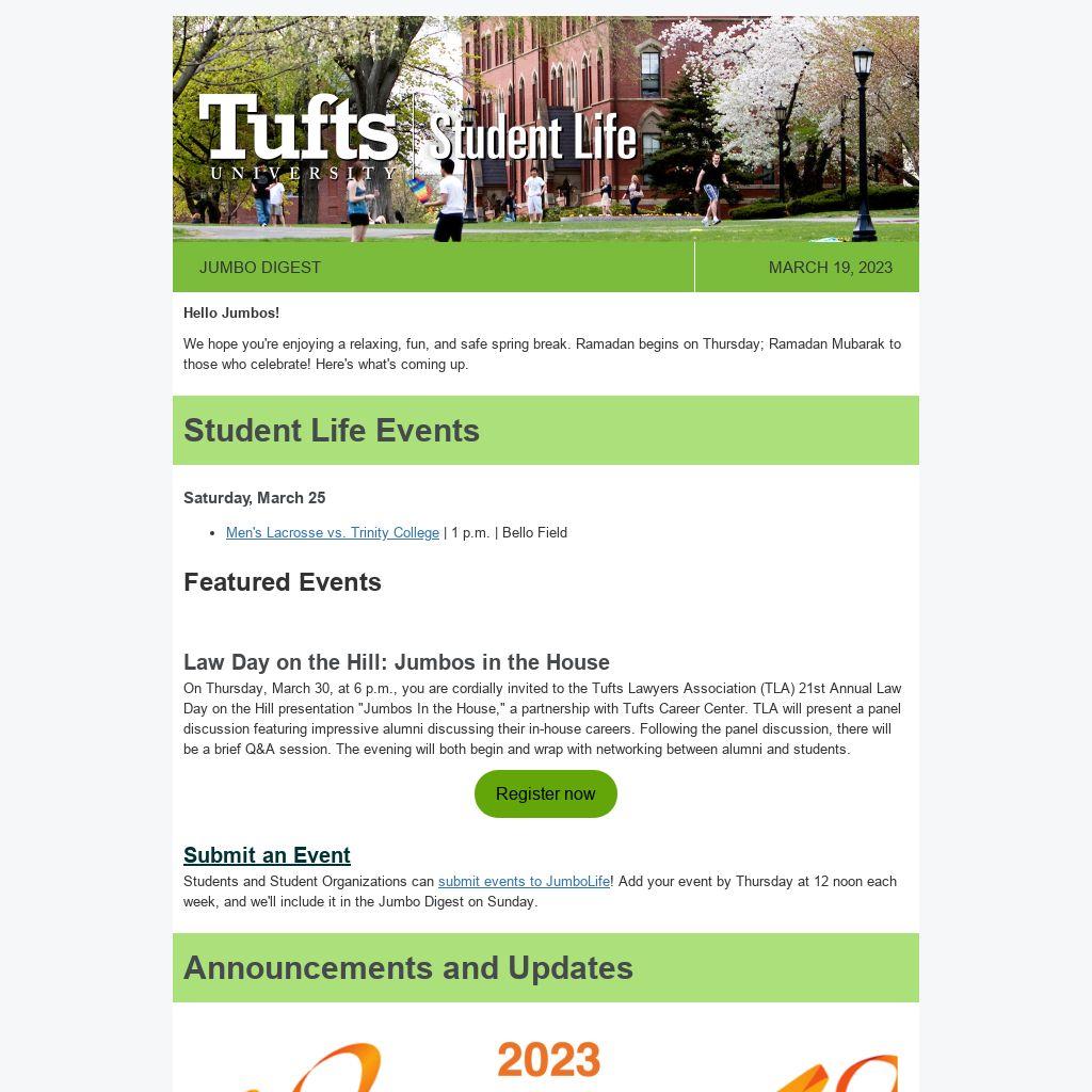 On Thursday, March 30, at 6 p.m., you are cordially invited to the Tufts Lawyers Association (TLA) 21st Annual Law Day on the Hill presentation "Jumbos In the House," a partnership with Tufts Career Center. TLA will present a panel discussion featuring impressive alumni discussing their in-house careers. Following the panel discussion, there will be a brief Q&A session. The evening will both begin and wrap with networking between alumni and students.