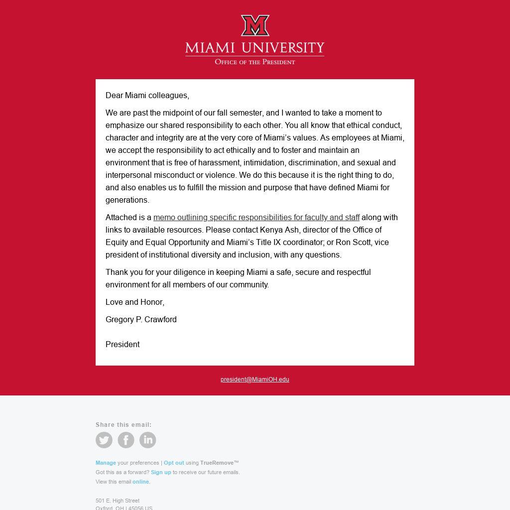 We are past the midpoint of our fall semester, and I wanted to take a moment to emphasize our shared responsibility to each other. You all know that ethical conduct, character and integrity are at the very core of Miami’s values. As employees at Miami, we accept the responsibility to act ethically and to foster and maintain an environment that is free of harassment, intimidation, discrimination, and sexual and interpersonal misconduct or violence. We do this because it is the right thing to do, and also enables us to fulfill the mission and purpose that have defined Miami for generations.