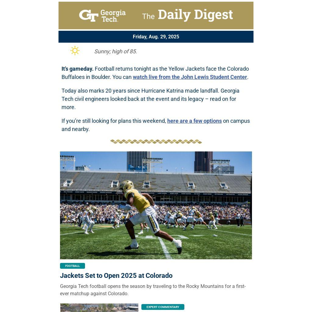 It’s gameday. Football returns tonight as the Yellow Jackets face the Colorado Buffaloes in Boulder. You can watch live from the John Lewis Student Center.