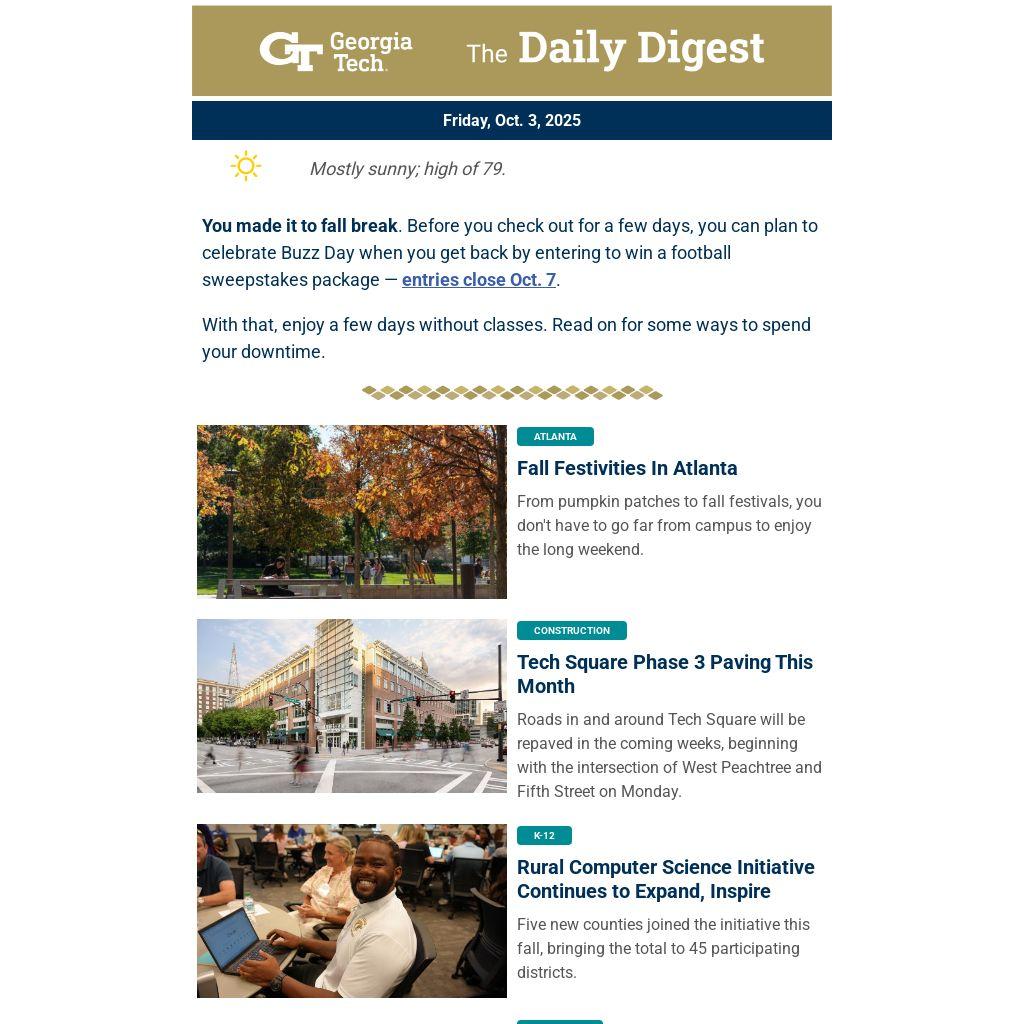 You made it to fall break. Before you check out for a few days, you can plan to celebrate Buzz Day when you get back by entering to win a football sweepstakes package — entries close Oct. 7.