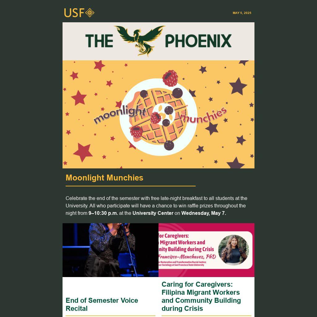 The Phoenix is a weekly e-newsletter sent by Student Leadership and Engagement to help students stay connected and get involved. It features campus events, leadership opportunities, athletic games, workshops, retreats, and more. Why “The Phoenix” title? The Phoenix has long been associated with the history and growth of USF as well as St. Ignatius, who encouraged followers to “go forth and set the world on fire.” Learn more »