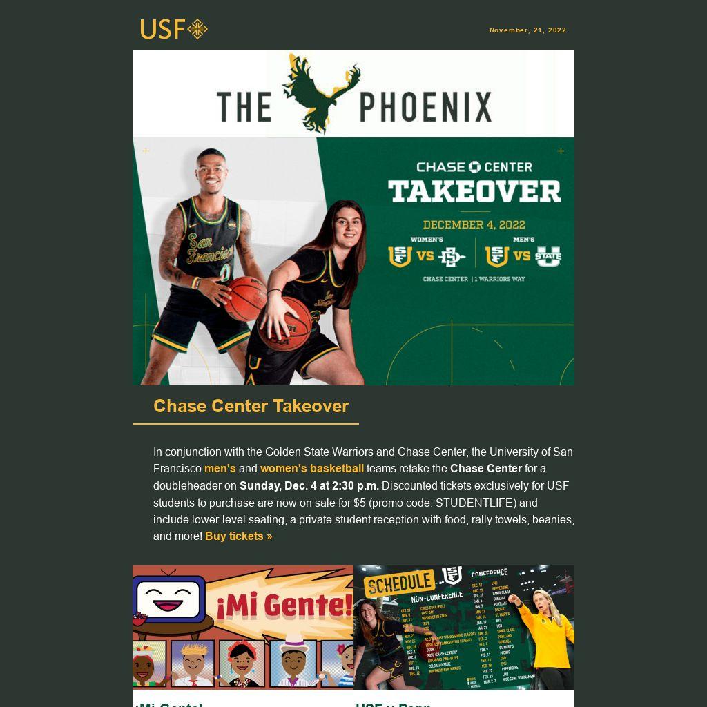 In conjunction with the Golden State Warriors and Chase Center, the University of San Francisco men's and women's basketballteams retake the Chase Center for a doubleheader on Sunday, Dec. 4at 2:30 p.m. Discounted tickets exclusively for USF students to purchase are now on sale for $5 (promo code: STUDENTLIFE) and include lower-level seating, a private student reception with food, rally towels, beanies, and more! Buy tickets »