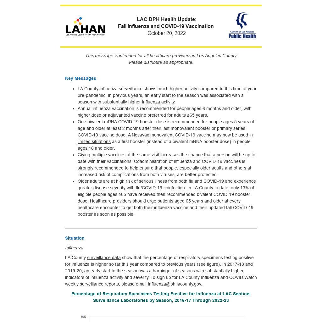 The LA County COVID-19 community transmission level is currently substantial. Based on data from Europe, experience from previous years, and concerns about the emergence of more contagious variants, providers should be prepared for a late fall/winter COVID-19 surge.
