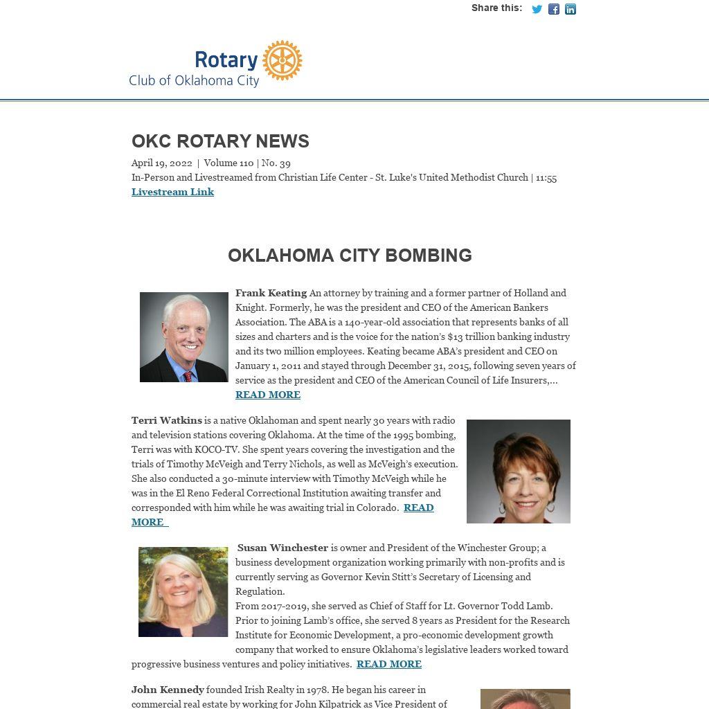 OKC Rotary NewsApril 19, 2022 | Volume 110 | No. 39 In-Person and Livestreamed from Christian Life Center - St. Luke's United Methodist Church | 11:55