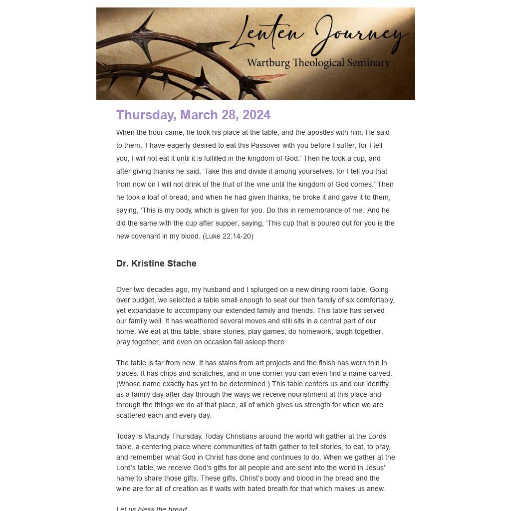 Today is Maundy Thursday. Today Christians around the world will gather at the Lords’ table, a centering place where communities of faith gather to tell stories, to eat, to pray, and remember what God in Christ has done and continues to do. When we gather at the Lord’s table, we receive God’s gifts for all people and are sent into the world in Jesus’ name to share those gifts. These gifts, Christ’s body and blood in the bread and the wine are for all of creation as it waits with bated breath for that which makes us anew.