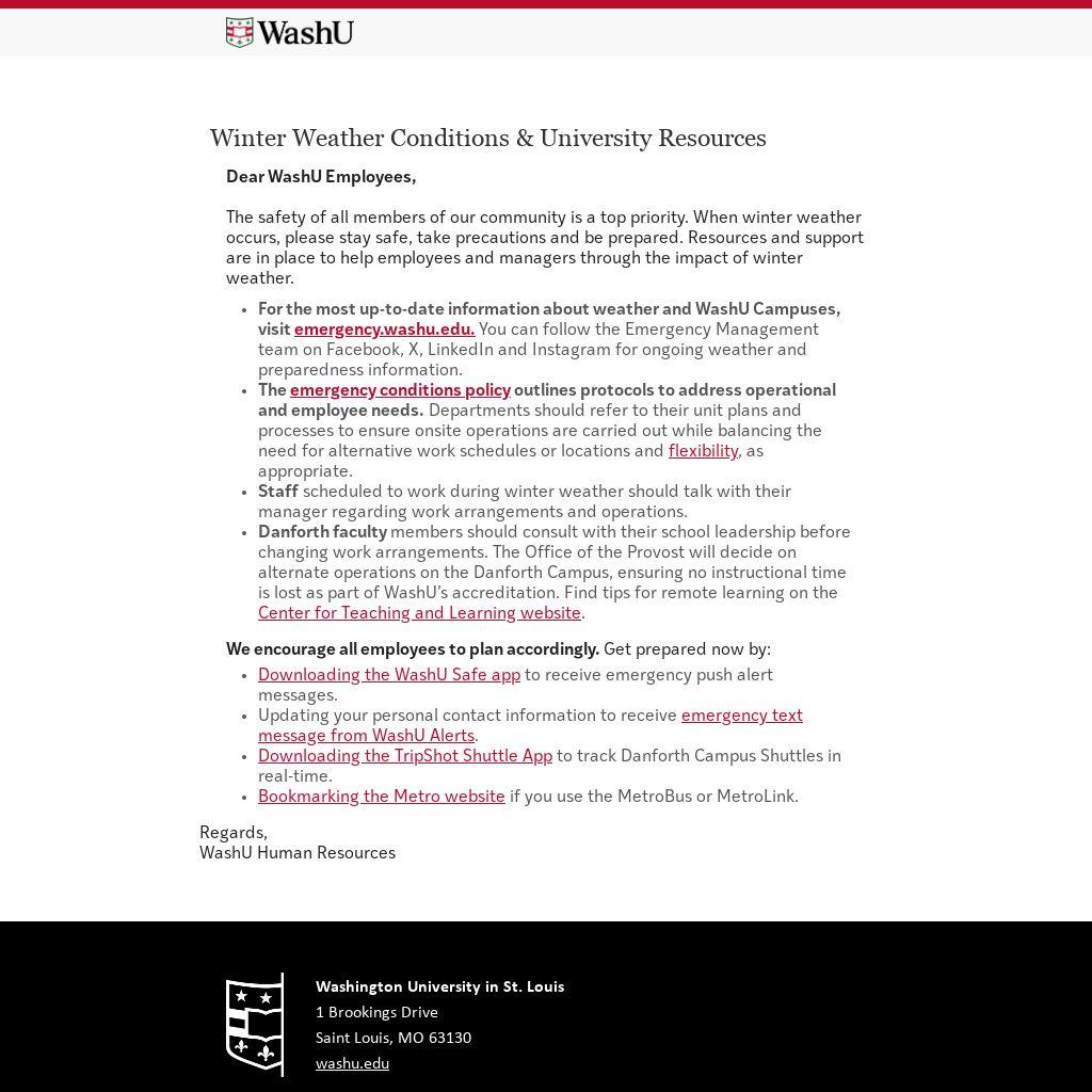 For the most up-to-date information about weather and WashU Campuses, visit emergency.washu.edu. You can follow the Emergency Management team on Facebook, X, LinkedIn and Instagram for ongoing weather and preparedness information.
