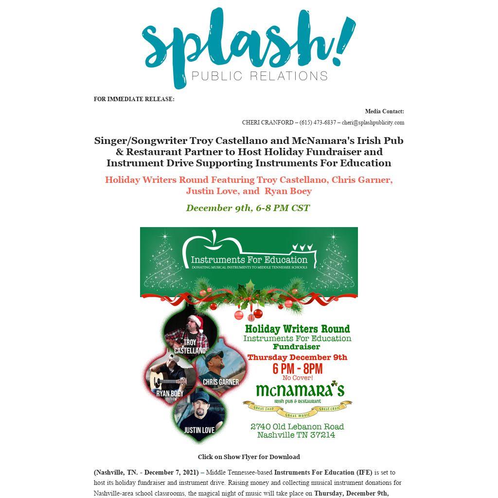 Singer/Songwriter Troy Castellano and McNamara's Irish Pub & Restaurant Partner to Host Holiday Fundraiser and Instrument Drive Supporting Instruments For Education