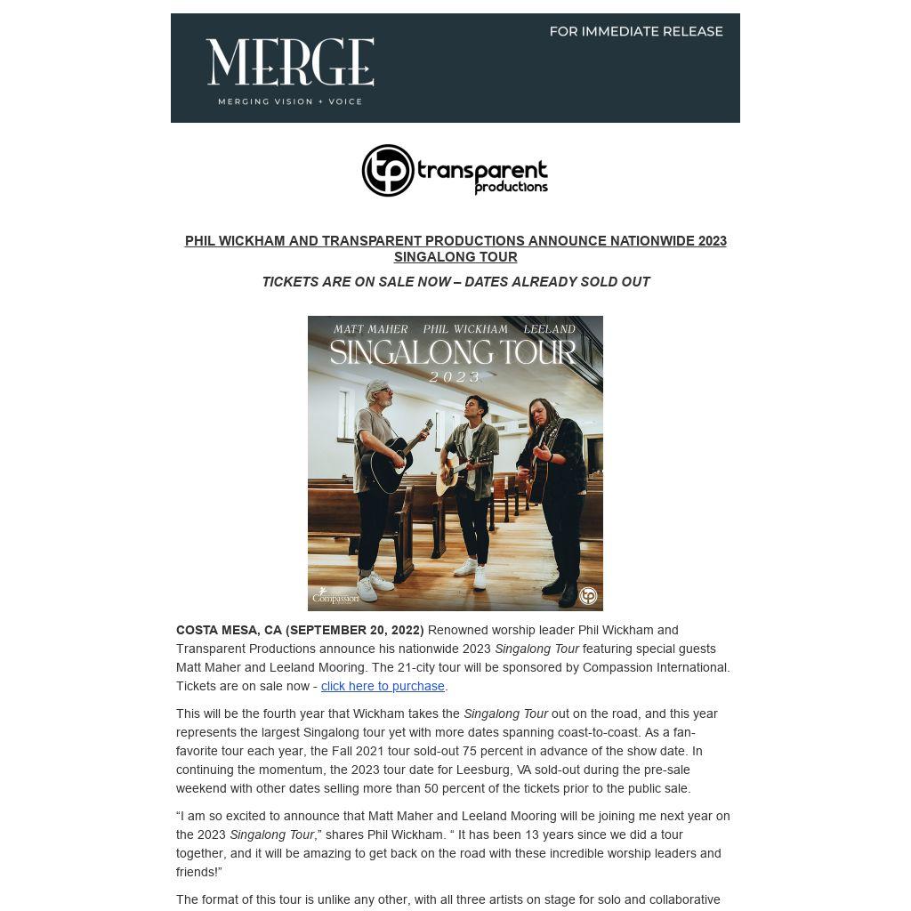 COSTA MESA, CA (SEPTEMBER 20, 2022) Renowned worship leader Phil Wickham and Transparent Productions announce his nationwide 2023 Singalong Tour featuring special guests Matt Maher and Leeland Mooring. The 21-city tour will be sponsored by Compassion International. Tickets are on sale now - click here to purchase.