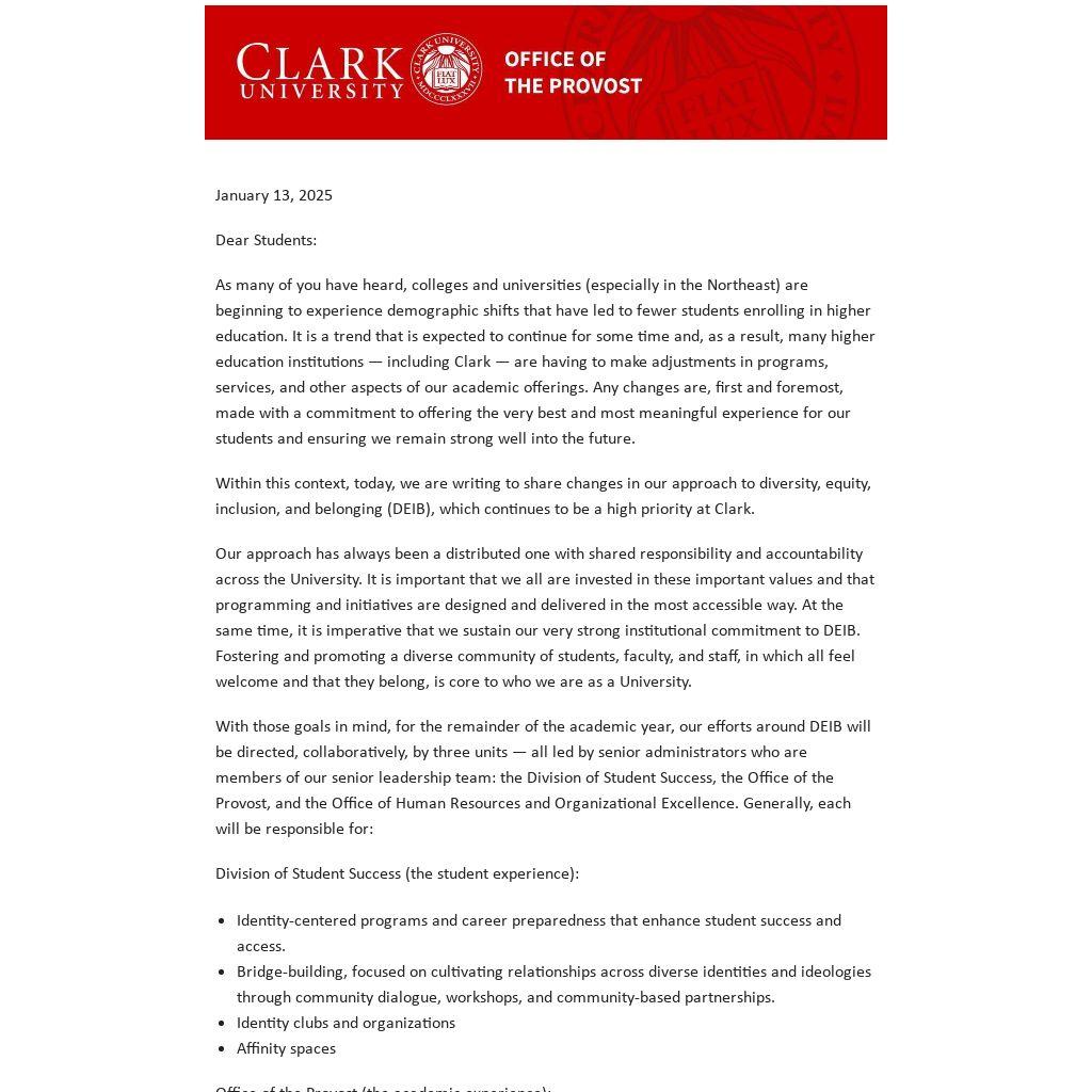 Within this context, today, we are writing to share changes in our approach to diversity, equity, inclusion, and belonging (DEIB), which continues to be a high priority at Clark.