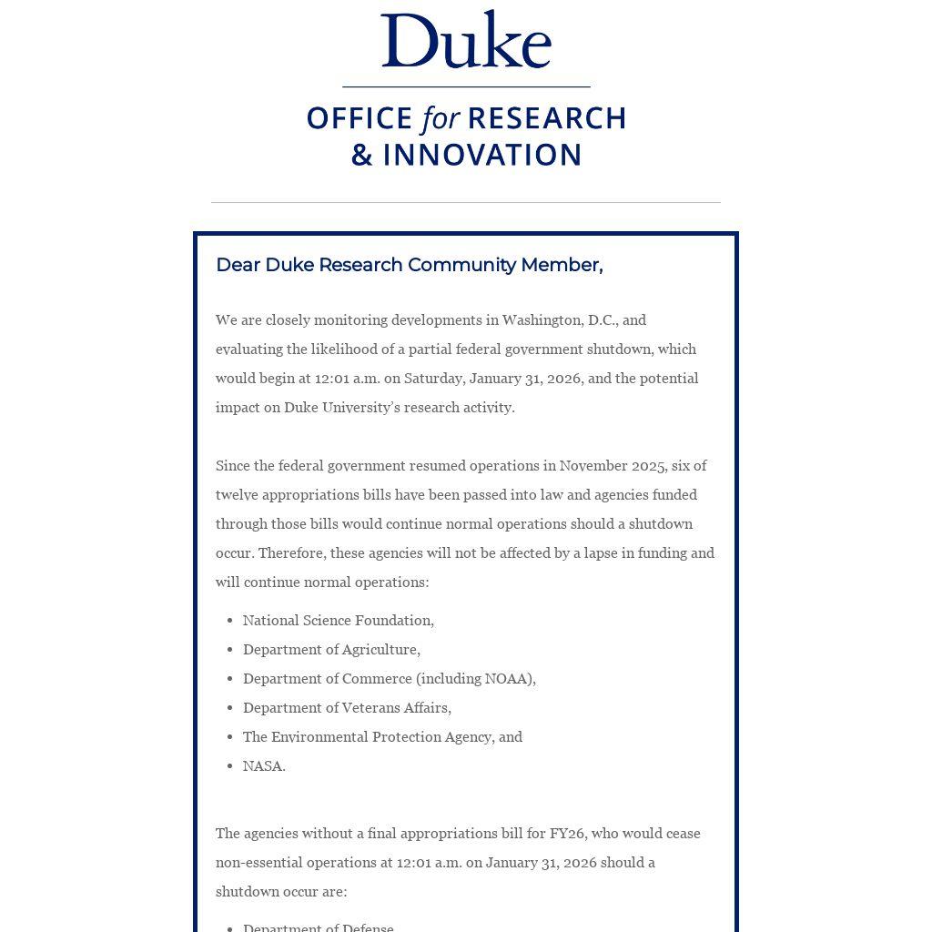 We are closely monitoring developments in Washington, D.C., and evaluating the likelihood of a partial federal government shutdown, which would begin at 12:01 a.m. on Saturday, January 31, 2026, and the potential impact on Duke University’s research activity.