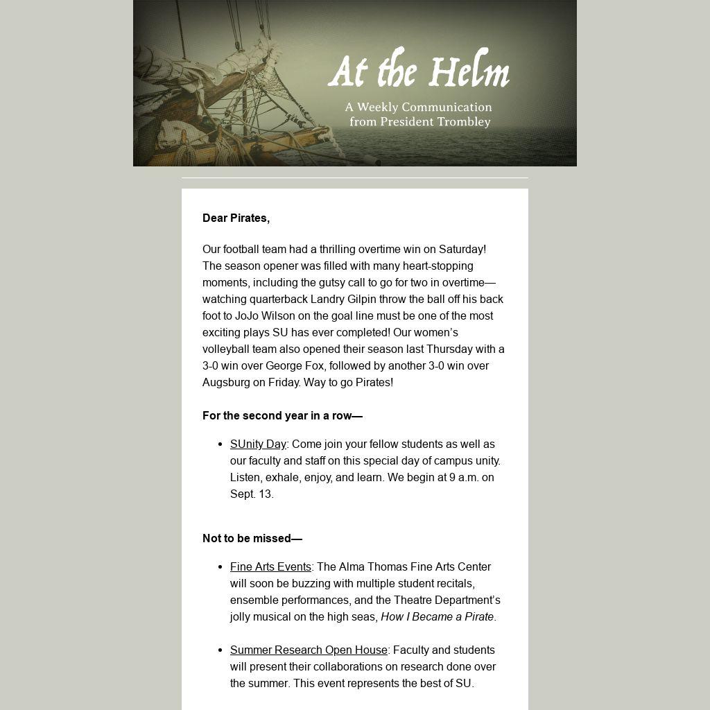 Our football team had a thrilling overtime win on Saturday! The season opener was filled with many heart-stopping moments, including the gutsy call to go for two in overtime—watching quarterback Landry Gilpin throw the ball off his back foot to JoJo Wilson on the goal line must be one of the most exciting plays SU has ever completed! Our women’s volleyball team also opened their season last Thursday with a 3-0 win over George Fox, followed by another 3-0 win over Augsburg on Friday. Way to go Pirates!