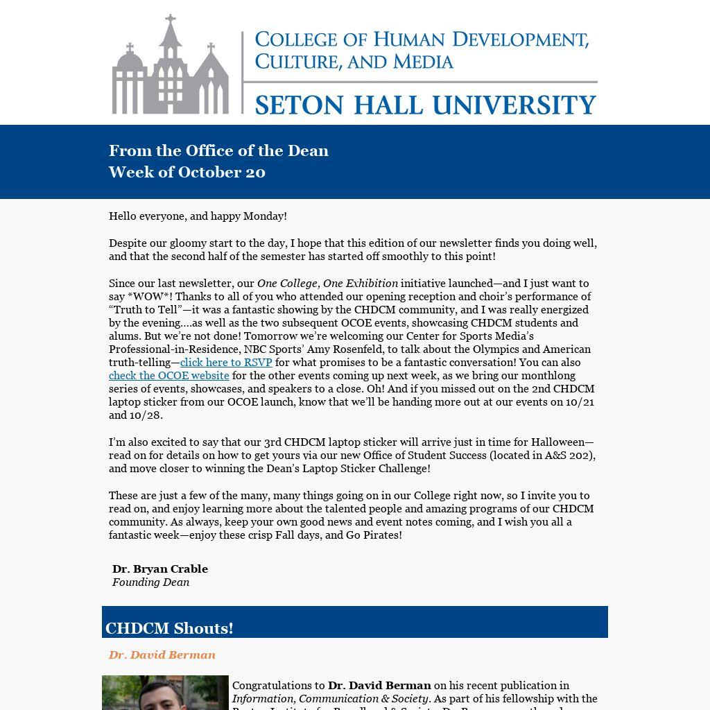 Since our last newsletter, our One College, One Exhibition initiative launched—and I just want to say *WOW*! Thanks to all of you who attended our opening reception and choir’s performance of “Truth to Tell”—it was a fantastic showing by the CHDCM community, and I was really energized by the evening….as well as the two subsequent OCOE events, showcasing CHDCM students and alums. But we’re not done! Tomorrow we’re welcoming our Center for Sports Media’s Professional-in-Residence, NBC Sports’ Amy Rosenfeld, to talk about the Olympics and American truth-telling—click here to RSVP for what promises to be a fantastic conversation! You can also check the OCOE website for the other events coming up next week, as we bring our monthlong series of events, showcases, and speakers to a close. Oh! And if you missed out on the 2nd CHDCM laptop sticker from our OCOE launch, know that we’ll be handing more out at our events on 10/21 and 10/28.