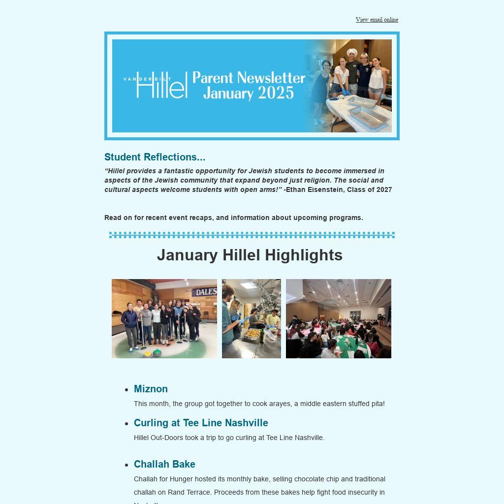 “Hillel provides a fantastic opportunity for Jewish students to become immersed in aspects of the Jewish community that expand beyond just religion. The social and cultural aspects welcome students with open arms!” -Ethan Eisenstein, Class of 2027