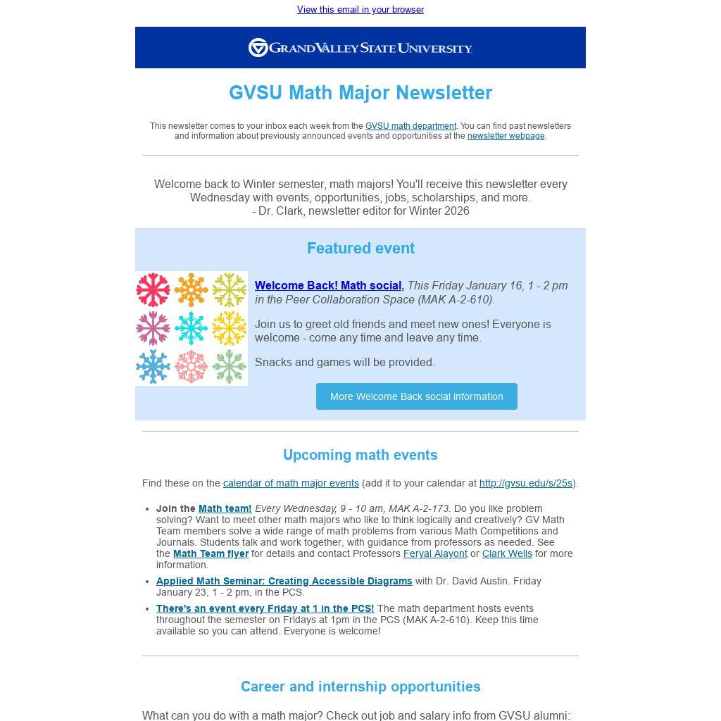This newsletter comes to your inbox each week from the GVSU math department. You can find past newsletters and information about previously announced events and opportunities at the newsletter webpage.
