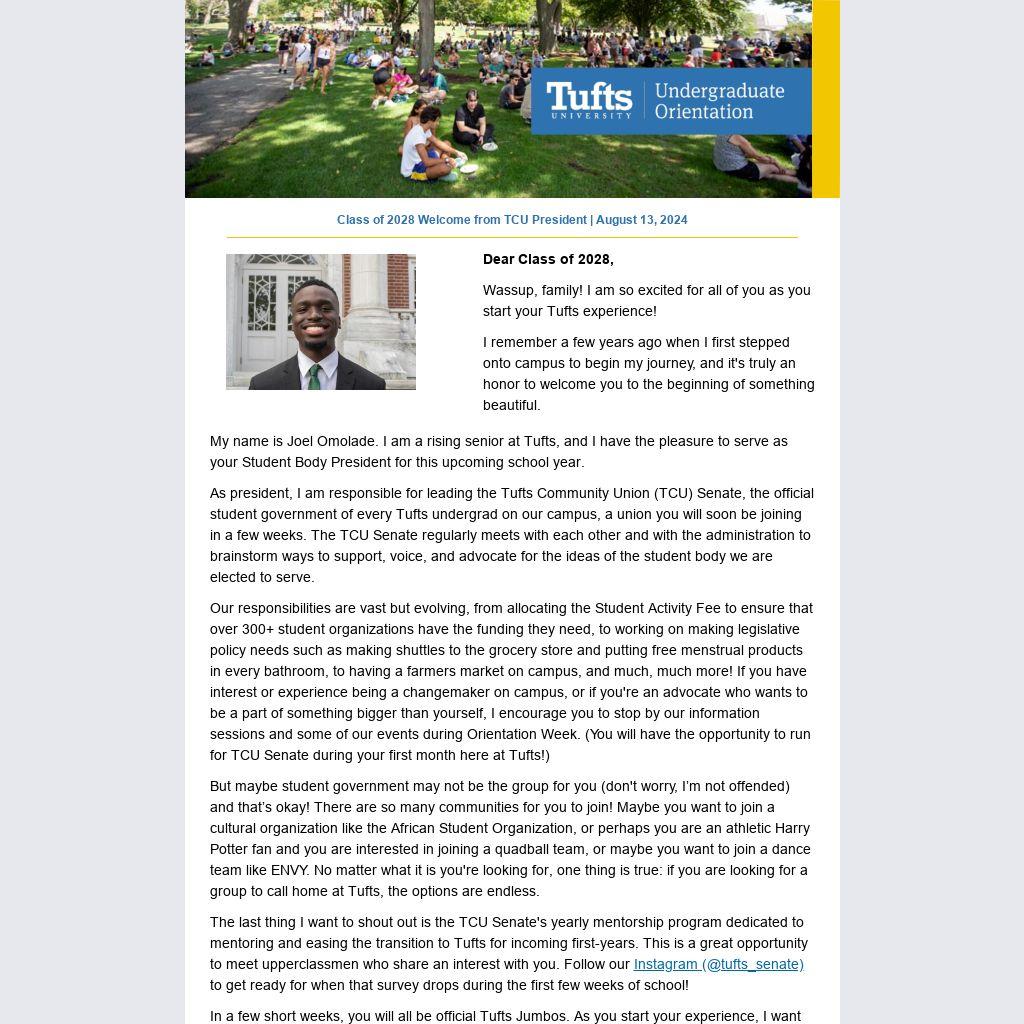 My name is Joel Omolade. I am a rising senior at Tufts, and I have the pleasure to serve as your Student Body President for this upcoming school year.