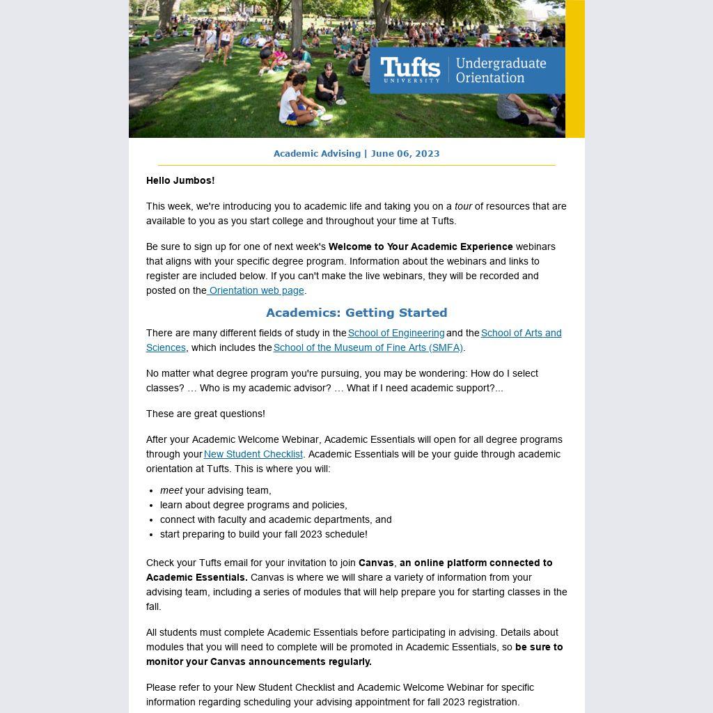 After your Academic Welcome Webinar, Academic Essentials will open for all degree programs through your New Student Checklist. Academic Essentials will be your guide through academic orientation at Tufts. This is where you will: