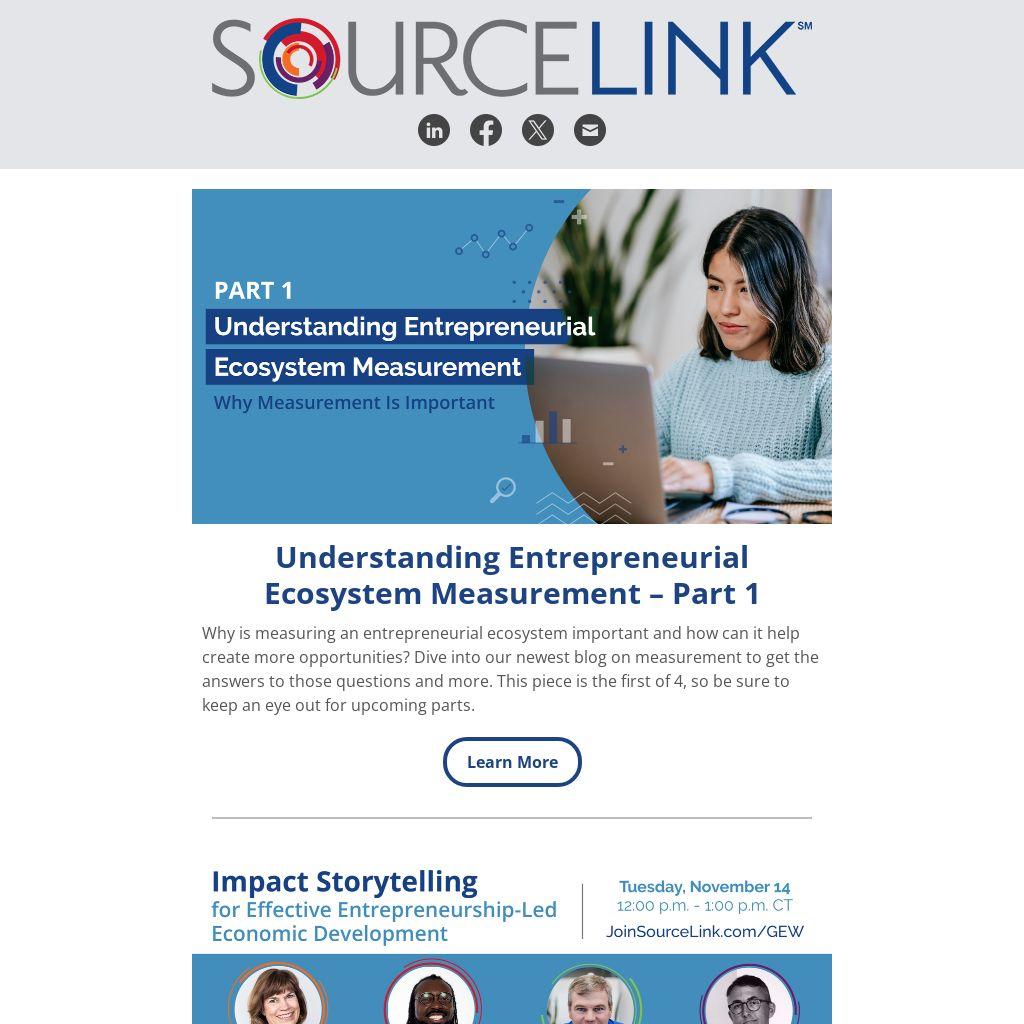 Global Entrepreneurship Week 2023 is only a few weeks away and spots are filling up fast for our SourceLink webinar “Impact Storytelling for Effective Entrepreneurship-Led Economic Development”. Join us on Tuesday, November 14 at 12:00 p.m. CT, where you’ll learn best practices on gathering data and reporting the impact of your entrepreneurial ecosystem.