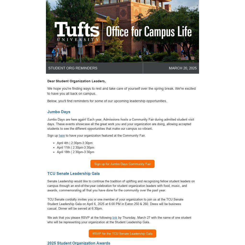 Let's celebrate your organization's accomplishments! The Tufts Community Union Judiciary Board is now accepting nominations for the annual student organization awards at https://go.tufts.edu/2025orgawards