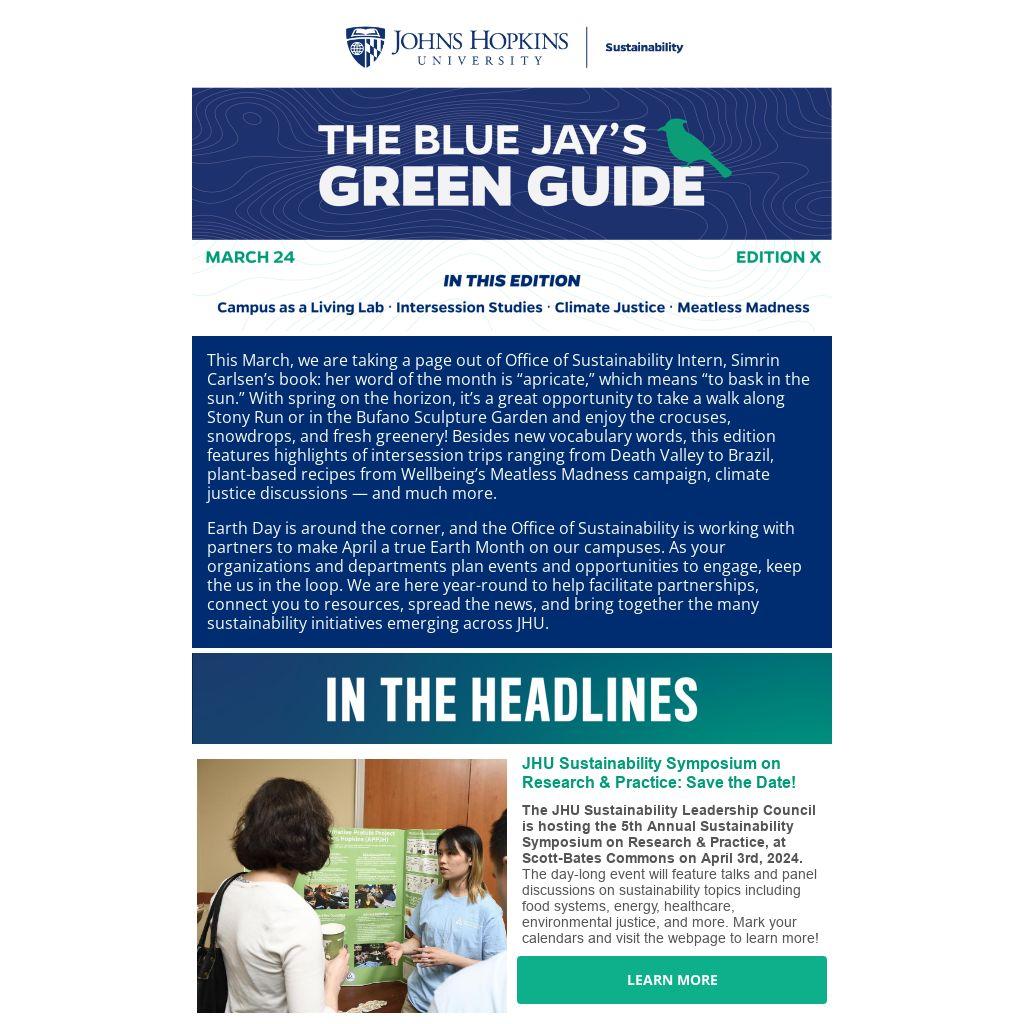 The JHU Sustainability Leadership Council is hosting the 5th Annual Sustainability Symposium on Research & Practice, at Scott-Bates Commons on April 3rd, 2024. The day-long event will feature talks and panel discussions on sustainability topics including food systems, energy, healthcare, environmental justice, and more. Mark your calendars and visit the webpage to learn more!