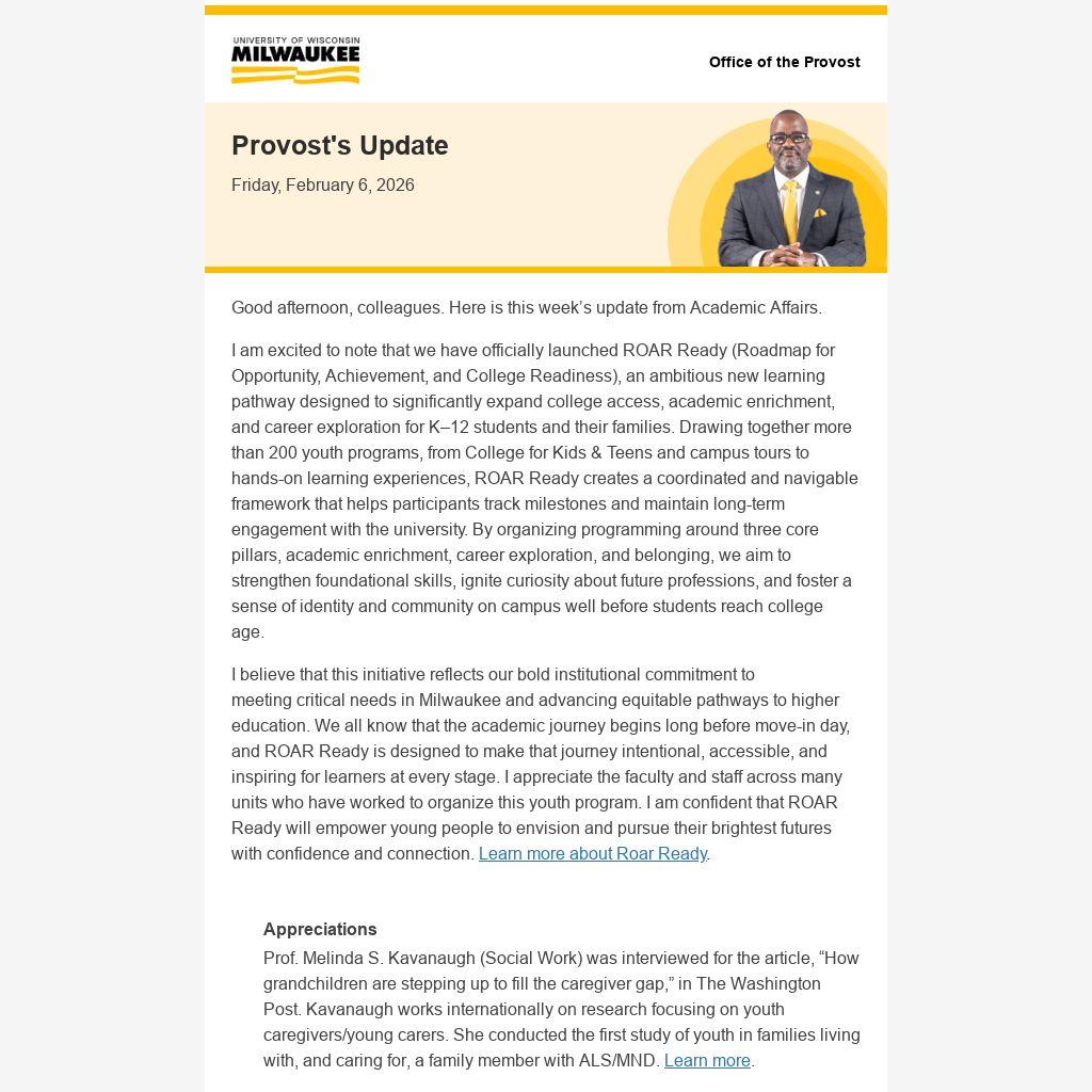 I believe that this initiative reflects our bold institutional commitment to meeting critical needs in Milwaukee and advancing equitable pathways to higher education. We all know that the academic journey begins long before move-in day, and ROAR Ready is designed to make that journey intentional, accessible, and inspiring for learners at every stage. I appreciate the faculty and staff across many units who have worked to organize this youth program. I am confident that ROAR Ready will empower young people to envision and pursue their brightest futures with confidence and connection. Learn more about Roar Ready.