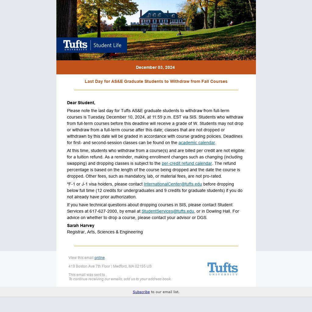 Please note the last day for Tufts AS&E graduate students to withdraw from full-term courses is Tuesday, December 10, 2024, at 11:59 p.m. EST via SIS. Students who withdraw from full-term courses before this deadline will receive a grade of W. Students may not drop or withdraw from a full-term course after this date; classes that are not dropped or withdrawn by this date will be graded in accordance with course grading policies. Deadlines for first- and second-session classes can be found on the academic calendar.